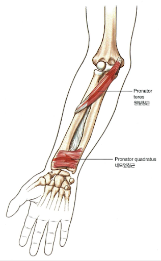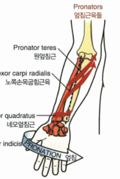 - 엎침근은 위팔뼈나 자뼈에서 기시 하고, 노뼈나 손에 정지해야 함