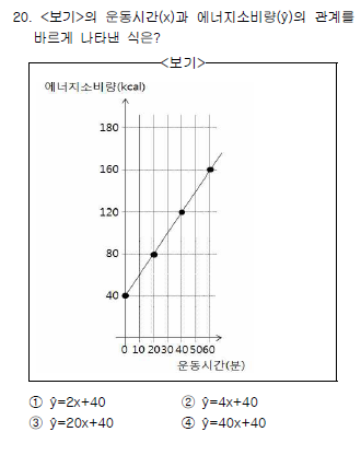 운동시간(x)이 20분 증가 시 에너지 소비량(y)이 40씩 늘어나므로 y = 2x + 40