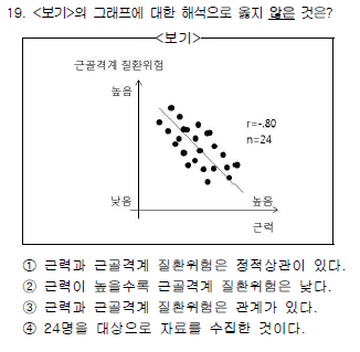 - ① : 근력이 이 높을수록 근골격계 질환 위험이 감소하므로 근력과 근골격계 질환 위험은 부적상관관계를 가진다.