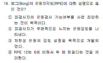 운동자각도(RPE)는 피검사자가 주관적으로 느끼는 운동 강도로 최대산소섭취량 등을 사용하지 못할 때 유용하게 사용됨