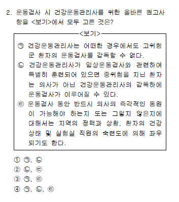 - ㄱ : 고위험군 환자의 운동검사를 실시할 때 감독이 필요한데, 이떄 감독은 건강운동관리사나 의사같이 자격이 있는 사람이 할 수 있음
