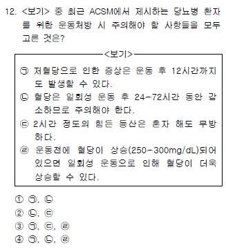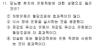 - ④ : 인슐린 이나 혈당강하제를 운동 직전에 사용하면 저혈당이 올 수 있음