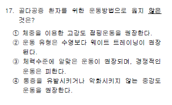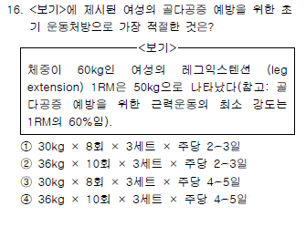 2016 건운사 필기시험 운동처방론 16~20번 문제는 골다공증 운동처방, 어린이 운동처방, 임산부의 운동, 노인의 운동에 대해 출제되었습니다.