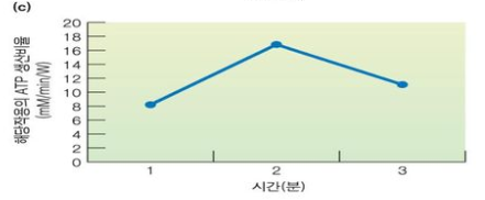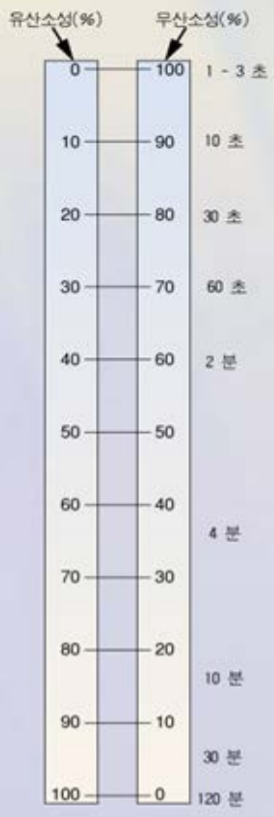 - 빠른 영역 : 운동 종료 후 2~3분 동안 산소섭취량이 빠르게 감소하는 영역으로, 산소가 ATP와 PC를 재합성하고 조직에 저장된 산소와 교체됨