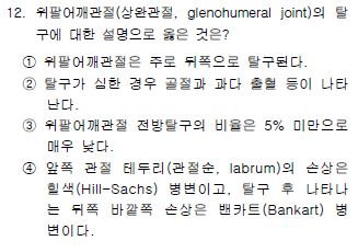 - ① :위팔어깨관절은 전방부가 후방부보다 약하기 때문에 주로 전방탈구가 많이 발생함