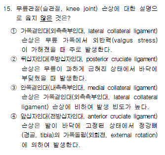 - ① : 무릎의 외측측부인대의 손상은 무릎 안쪽에서 내반력이 가해졌을때 주로 발생함