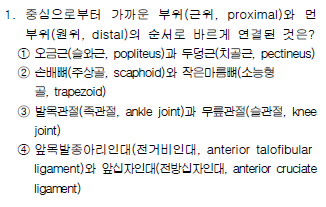 - ④ : 앞목말종아리인대는 발목관절, 앞십자인대는 무릎관절이므로 앞목말종아리인대는 원위, 앞십자인대는 근위