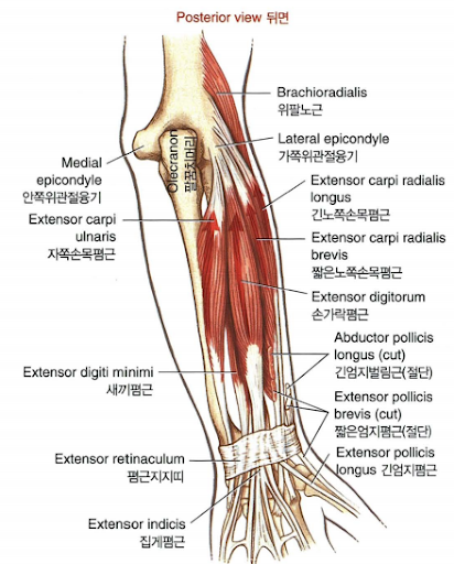 - 위팔뼈 가쪽위관절융기 ~ 둘째 손허리뼈바닥의 등쪽에 부착
