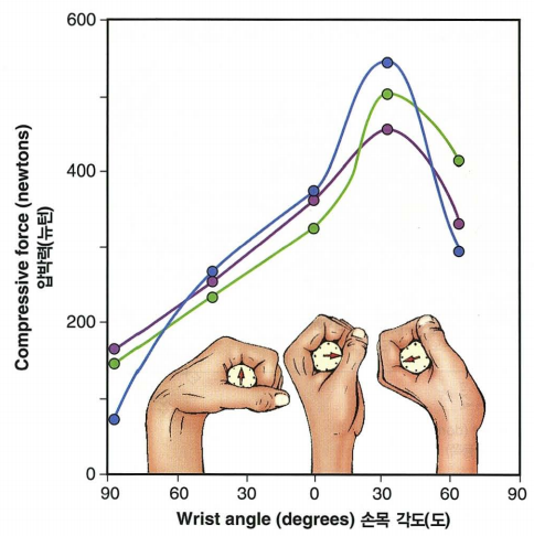 - 그러므로 손목이 굽힘되면 손가락 굽힘근이 짧아져 길이-장력 관계에 따라 악력이 감소함