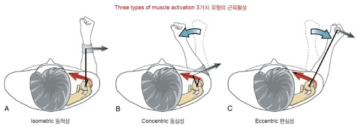3. 근육 길이 변화 없이 장력 생산하는 등척성 활성, 근육 길이가 짧아지며 장력 생산하는 동심성 활성, 근육 길이가 길어지며 장력 생산하는 편심성 활성