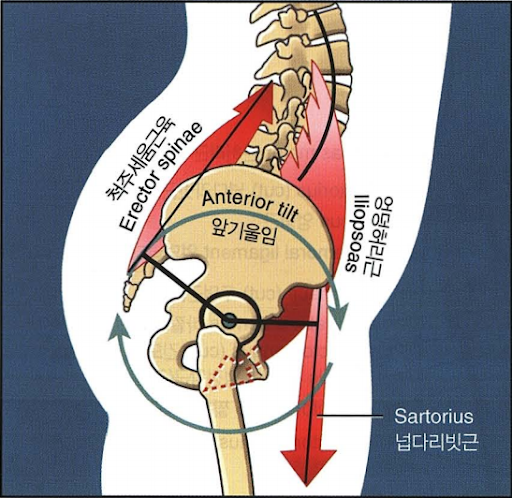 - ex) 골반 앞 기울 임시 척추 세움근(기립근)의 위쪽 당김 + 엉덩관절 굽힘근들의 아래쪽 당김 등