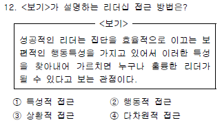 - ③ : 상황 이론 : 리더의 권위, 추종자의 능력 등과 같은 환경과 상황의 요구에 따라 리더쉽이 달라진다는 이론
