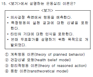 - 건강신념이론 : 질병의 인식과 신체활동이 질병의 위험을 감소시킬 것으로 생각할 때 운동에 대한 의지가 나타난다는 이론