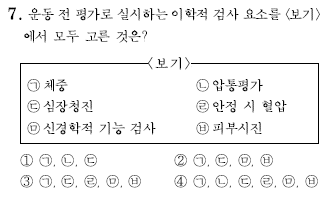 2017년 건운사 필기시험 건강체력평가 6~10번 문제는 심혈관질환자의 위험군분류, 이학적 검사, 대사증후군의 정의, 1RM 측정, 골관절염에 대해 출제되었습니다.