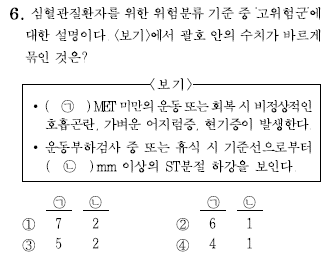 심혈관질환자가 5MET 미만의 운동 시 비정상적인 증상이 나타나거나 운동부하검사 중 2mm 이상의 ST분절 하강이 발생하면 고위험군에 속함