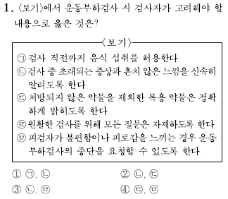 - ㄱ : 검사 직전까지의 음식 섭취는 검사에 방해가 되므로 검사 1~2시간 전에 음식 섭취를 금지함