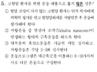 2017년 건운사 운동처방론 1~5번 문제는 운동부하검사 시 고려사항, 심폐지구력 트레이닝, 저항성 트레이닝, 고혈압 환자의 운동 주의사항에 대해 출제되었습니다.