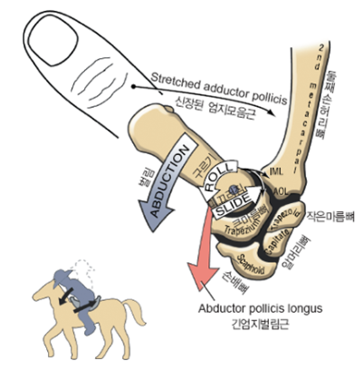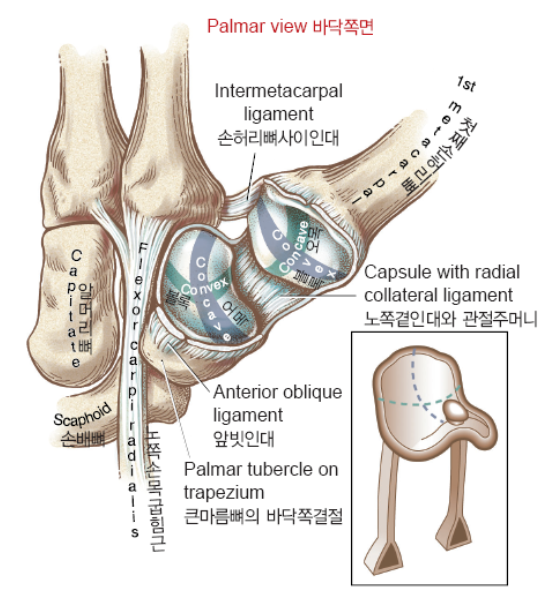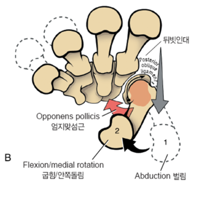 - 굽힘 시 엄지 손허리뼈바닥이 큰마름뼈의 고랑 내에서 안쪽돌림함