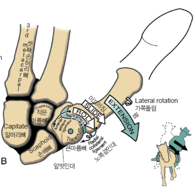- 손허리뼈의 볼록관절면이 큰마름뼈의 오목관절면에 대해 등쪽 구르기 + 바닥쪽 미끄러짐