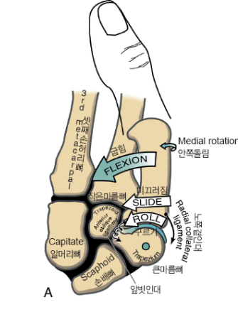 - 손허리뼈의 볼록관절면이 큰마름뼈의 오목관절면에 대해 바닥쪽 구르기 + 등쪽 미끄러짐