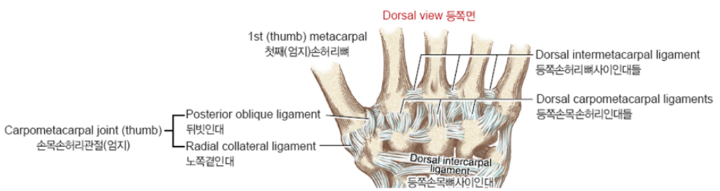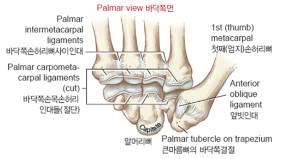 - 둘째~다섯째 손목손허리관절을 서로 연결시켜 손목손허리관절의 안정성을 높여줌