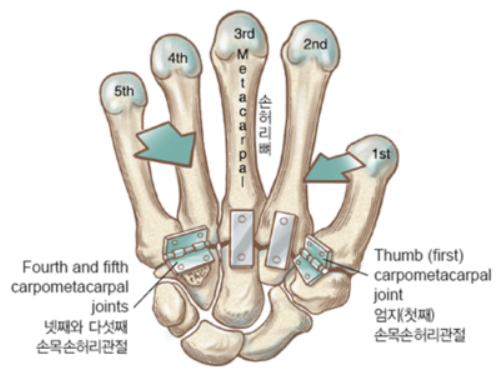 - 최대 벌림 시 손허리뼈가 손바닥에서 45도 위치에 놓임