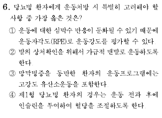 2017년 건운사 운동처방론 6~10번 문제는 당뇨병 환자의 운동처방 시 주의사항, ACSM의 어린이 운동처방, ACSM의 비만환자 운동처방, 고령자의 운동부하검사, 대사량을 통한 칼로리 소비와 운동시간 계산에 대해 출제되었습니다.