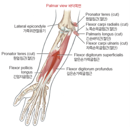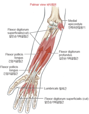 - 위팔뼈 안쪽위관절융기, 자뼈 부리돌기에서 2~5 중간손가락뼈 바닥 양면에 부착됨