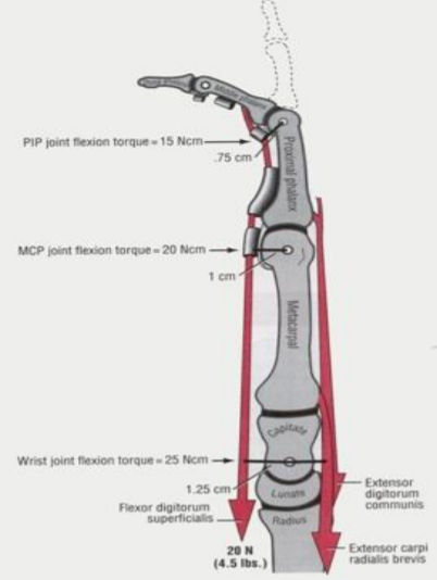 4. 손가락의 폄 시 손가락폄근은 다관절 근육이기 때문에 특정한 관절에서만 폄하기 위해서는 폄근의 작용방향과 반대되는 굽힘근이 작용해서 안정화하는 것