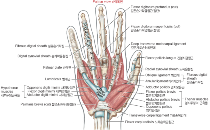 - 먼쪽손바닥주름에서 DIP관절까지 힘줄을 에워쌈