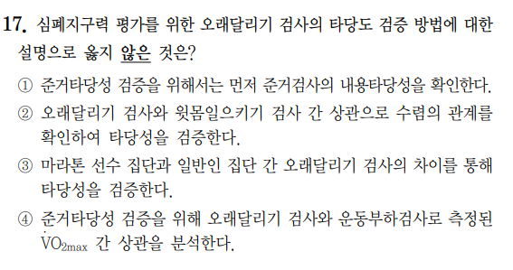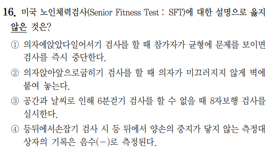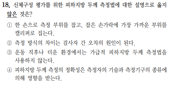 2018년 건운사 건강체력평가 15~20번 문제는 노인체력검사, 심폐지구력 평가 타당도 검사, 피부두겹법, 건강체력검사, 신체활동량검사에 대해 출제되었습니다.