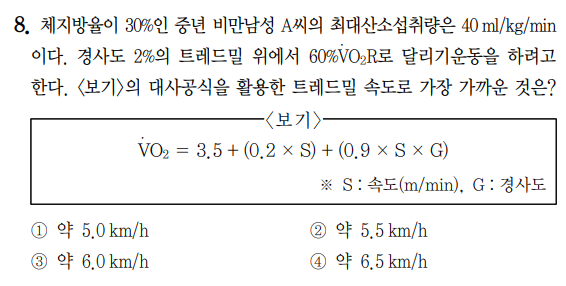 2018년 건운사 운동처방론 6~10번 문제는 ACSM에 따른 당뇨환자 FITT, 약물 복용하는 고혈압 환자의 운동처방, 대사공식 활용한 트레드밀 속도 구하기, ACSM에 따른 이상지질혈증 환자의 FITT, ACSM에 따른 유산소 운동의 강도에 대해 출제되었습니다.