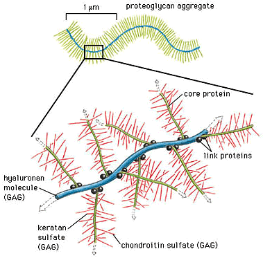 - 큰 프로테오글리칸 복합체(large proteoglycan complex) : 곁단위가 히알루론산에 부착해 형성되며 물을 무게의 50배까지 끌어당김