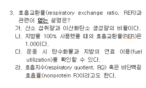 지방 100% 사용시 호흡 교환율은 0.7이고, 탄수화물 100% 사용 시 호흡 교환율은 1.00