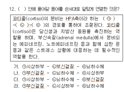 코티졸의 분비는 스트레스 받을 때 시상하부에서 코티코트로핀 분비 호르몬 분비 → 뇌하수체에서 부신피질 자극 호르몬 방출 → 부신피질에서 코티졸 분비로 조절된다.