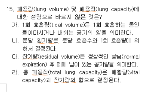 - 폐용적 : 1회 호흡량(정상 호흡 시 흡기와 호기량), 흡기 예비 용적(흡기 종료 후 더 흡기할 수 있는 가스량), 호기예비용적(호기 종료 후 더 호기 될 수 있는 가스량), 잔기량(최대 호기 후 남은 폐속의 가스량)