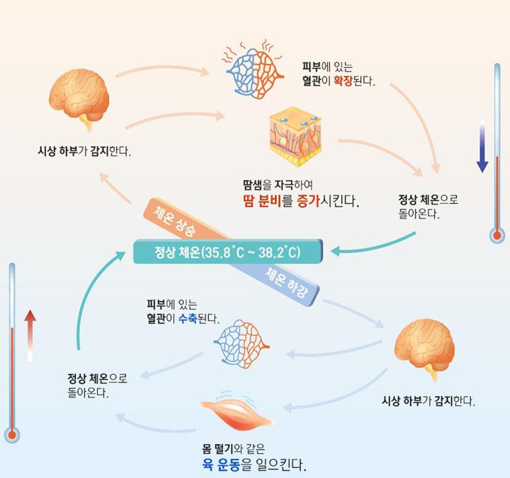 - 체온 증가 시 : 열 수용기 → 열 조절 센터 → 혈관 확장, 땀 배출 → 열손실 → 정상상태