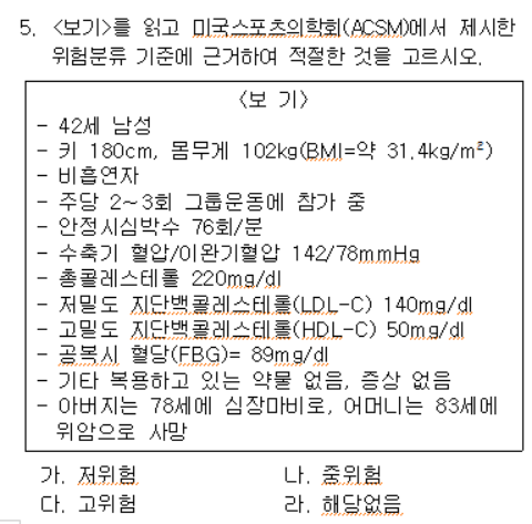 2015년 건운사 필기시험 건강체력평가 1~5번 문제는 신체활동과 질병, 운동참여 전 사전검사, ACSM의 위험분류에 대해 출제되었습니다.