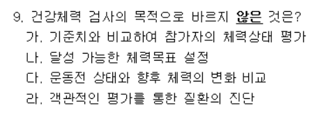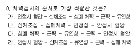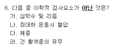 2015년 건운사 필기시험 건강체력평가 6~10번 문제는 이학적 검사, 건강체력검사, 운동검사의 금기사항에 대해 출제되었습니다.