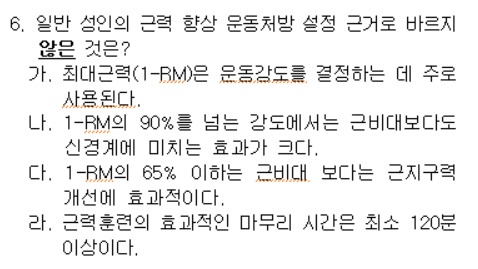 2015년 건운사 필기시험 운동처방론 6~10번 문제는 근력/유연성 운동처방, 비만환자와 고혈압 질환자의 운동처방에 대해 출제되었습니다.