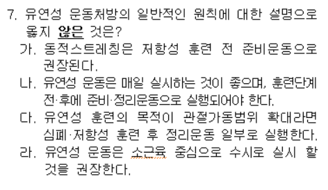 - 가 : 정적 스트레칭을 저항성 운동 전에 실시하면 운동 수행에 부정적인 영향을 미칠 수 있다.