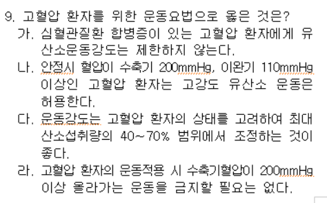 - 나 : 안정시 수축기 혈압이 200mmHG, 이완기 혈압이 110mmHG 이상인 고혈압 환자는 운동을 금지한다.