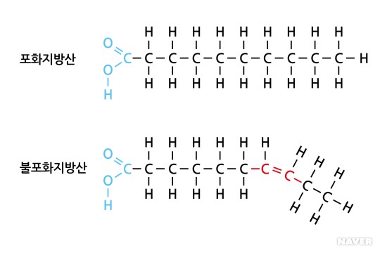 - 불포화지방산 :탄소의 이중결합을 가지고 있는 지방산으로 LDL 콜레스테롤(나쁜 콜레스테롤)을 낮추고 HDL 콜레스테롤(좋은 콜레스테롤)을 높임