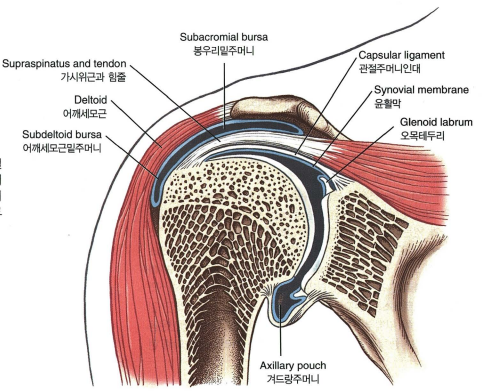 - 어깨 세모근, 가시위근 힘줄, 위팔뼈머리 사이의 마찰력 줄임
