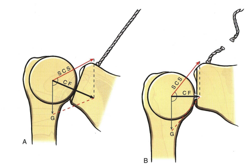 - 휴식 시 팔을 편안히 늘어뜨린 채 서 있을 때, 위팔뼈머리가 관절 오목에 대해 안정된 상태