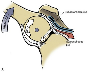 - 볼록한 위팔뼈머리가 오목한 어깨뼈 관절 오목에 대해 위쪽으로 구르기 + 아래로 미끄러짐으로 발생