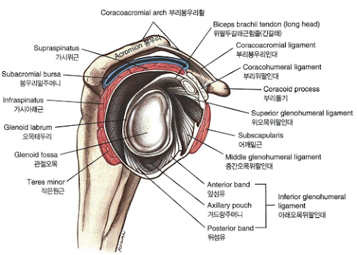 - 윤활막(synovial membrane) : 관절주머니 안을 지나가는 위팔두갈래근의 긴 힘줄과 나란히 놓임