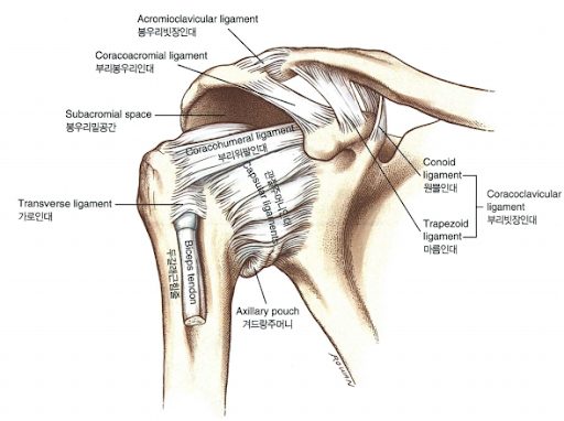 - 겨드랑이주머니(액와낭, Axillary pouch) : 관절주머니의 느슨한 부분