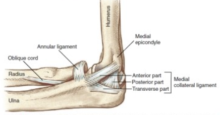 2. 안쪽곁인대는 팔꿈치 관절의 안쪽에 있는 인대로 팔꿈치를 밖굽이 만드는 힘에 저항하고 팔꿈치 관절의 안정성을 높여주며, 앞섬유/뒤섬유/가로섬유로 구성됨