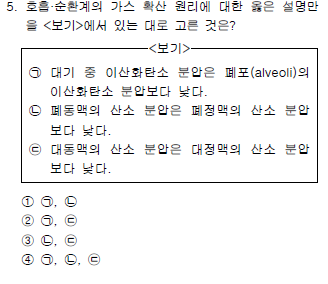 호흡계/순환계는 가스의 확산으로 인해 이루어지는데 가스의 확산은 분압이 높은 곳에서 분압이 낮은 곳으로 이동하는것으로, 이산화탄소를 내뿜기 위해서는 폐포보다 대기의 이산화탄소 분압이 낮아야 하며, 동맥의 산소분압은 정맥보다 높다.